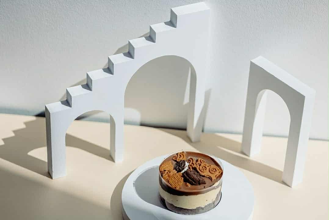 Impressive pastry, a combination of flavors with an explosive result, biscuit cream, and Praline ripple, with pieces of biscuit, and garnished with hazelnut Praline