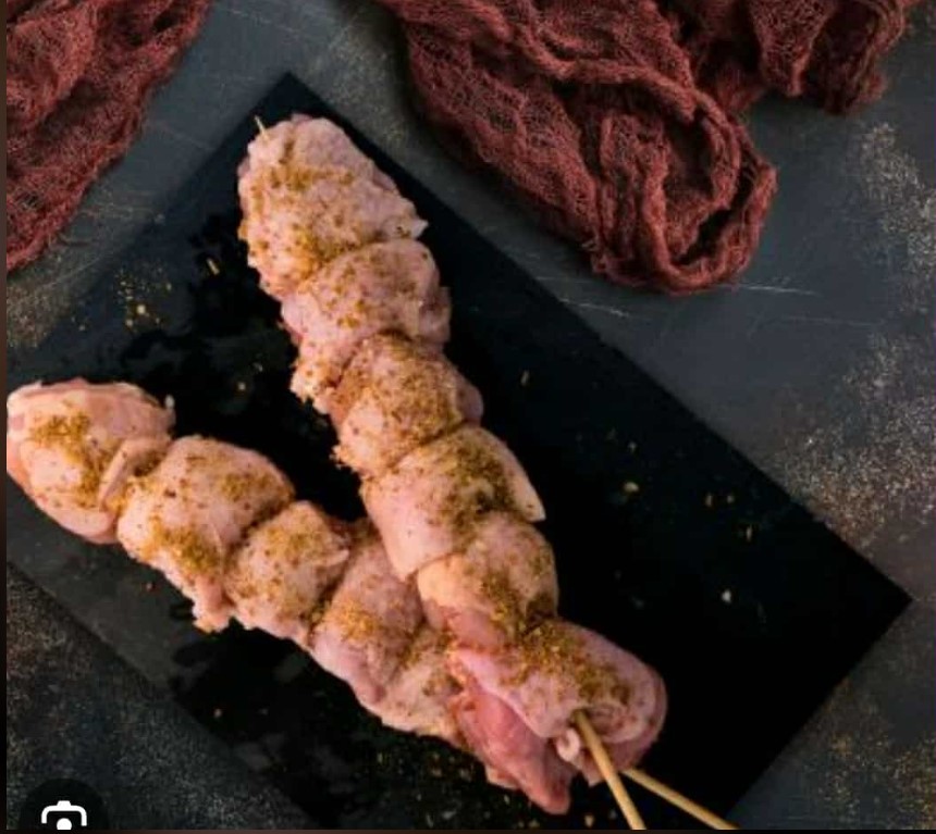Chicken kontosovli in a net for the oven ready with the spices of onion tomatoes.