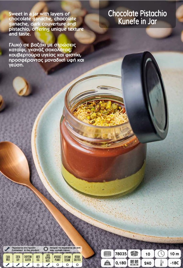 Sweet in a jar with layers of chocolate ganache, chocolate ganache, dark couverture and pistachio, offering unique texture and taste.