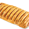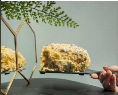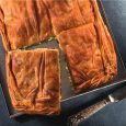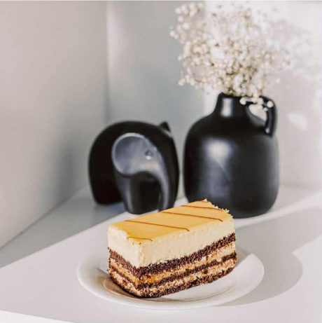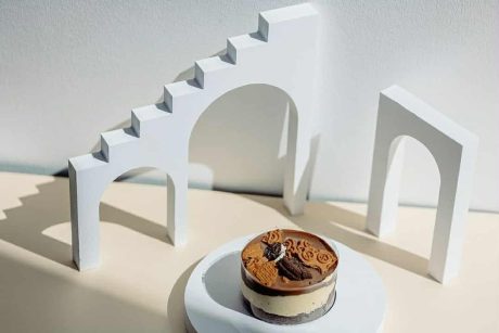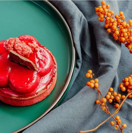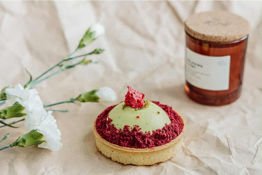 Butter tart filled with Aegina Pistachio cream, a layer of white sponge cake and red fruit jam. Topped with a white chocolate ganache infused with Pistachio puree.
