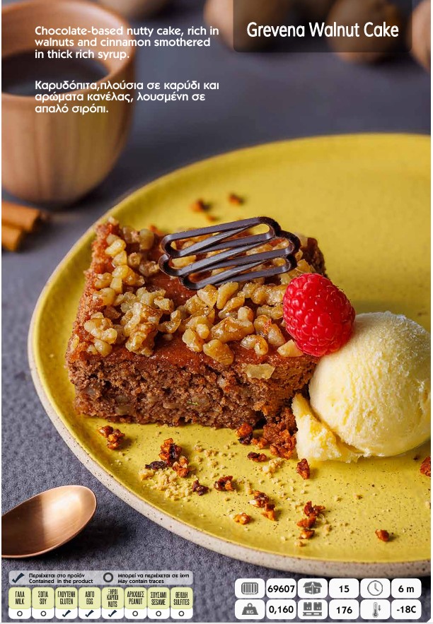 Chocolate-based nutty cake, rich in walnuts and cinnamon smothered in thick rich syrup.